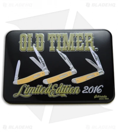 This Schrade Old Timer Limited Edition Gift Set features three high quality pocket knives, packaged together in a collectible tin gift-box. It includes a Premium Stock, a Dog Leg Jack and a PAL pocket knife. They come equipped with yellow delrin handles and stainless steel blades. The PAL has a single clip point blade, the Premium Stock is a three blade Stockman knife and the Dog Leg Jack is a two blade Trapper knife. The Old Timer Gift Set from Schrade offers a limited edition set of knives at an unbeatable price.