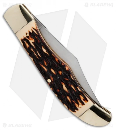 This Uncle Henry Bowie Folding Knife embodies the traditional American pocket knife. This large pocket knife features high carbon stainless steel clip point and drop point blades with a satin finishes and heat treated back springs. The Staglon handle features polished nickel silver bolsters, brass liners, and brass rivet construction. Comes with a button snap leather sheath with belt loop.