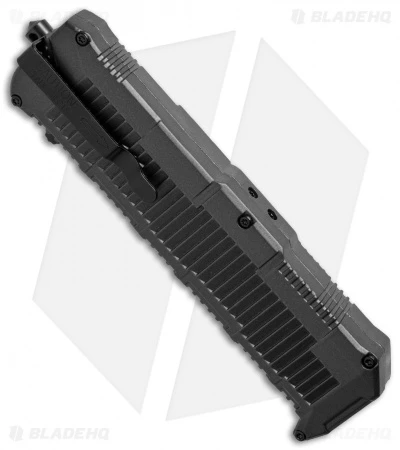 Schrade’s Viper OTF looks like a design from the future. The tanto blade is made of AUS-8 high carbon stainless steel with a black finish and partially serrated edge. The futuristic handle is crafted from black aluminum so it’s lightweight and easy to manage. To open the blade, switch off the safety lock and press the sliding release forward. The knife opens fast and smoothly, and the lock up is tight. To close the blade, push the small blade release button forward, the slide the blade back with the bottom actuator until it locks into place. The pommel of this knife features a small glass breaker tip and a removable, tip-down carry pocket clip.